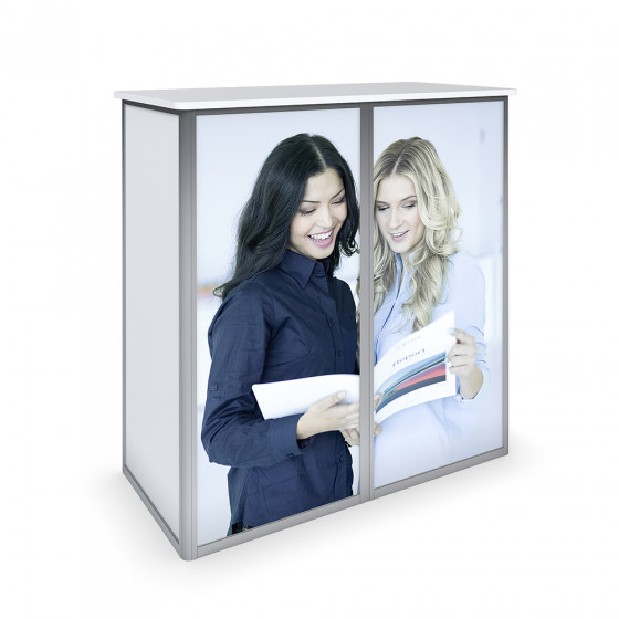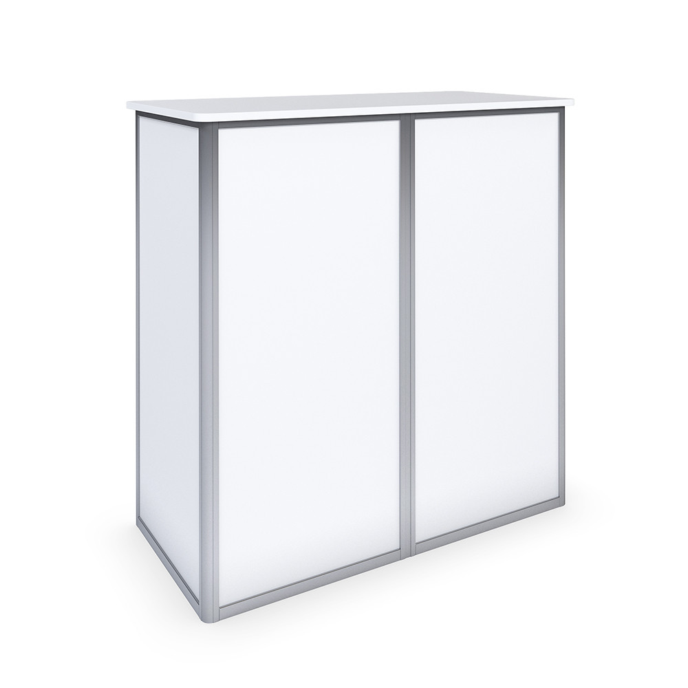 Das SYMA-DECO Thekensystem ist in den verschiedensten Varianten lieferbar. Die Theken lassen sich leicht transportieren, sind im "Handumdrehen" aufgebaut und nach der Präsentation wieder vollständig zusammenklappbar. Optimal in Kombination mit kundenspezifischer Grafik.