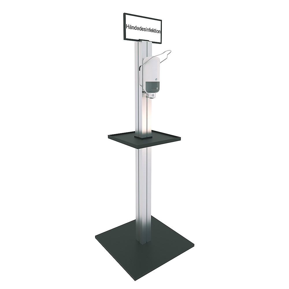Desi-Hygienetower mit nachfüllbarem Spendersystem Komplett-Set inkl. Standfuss, Auffangschale, Informationsschild mit Aufschrift ""Händedesinfektion"" und Spender.