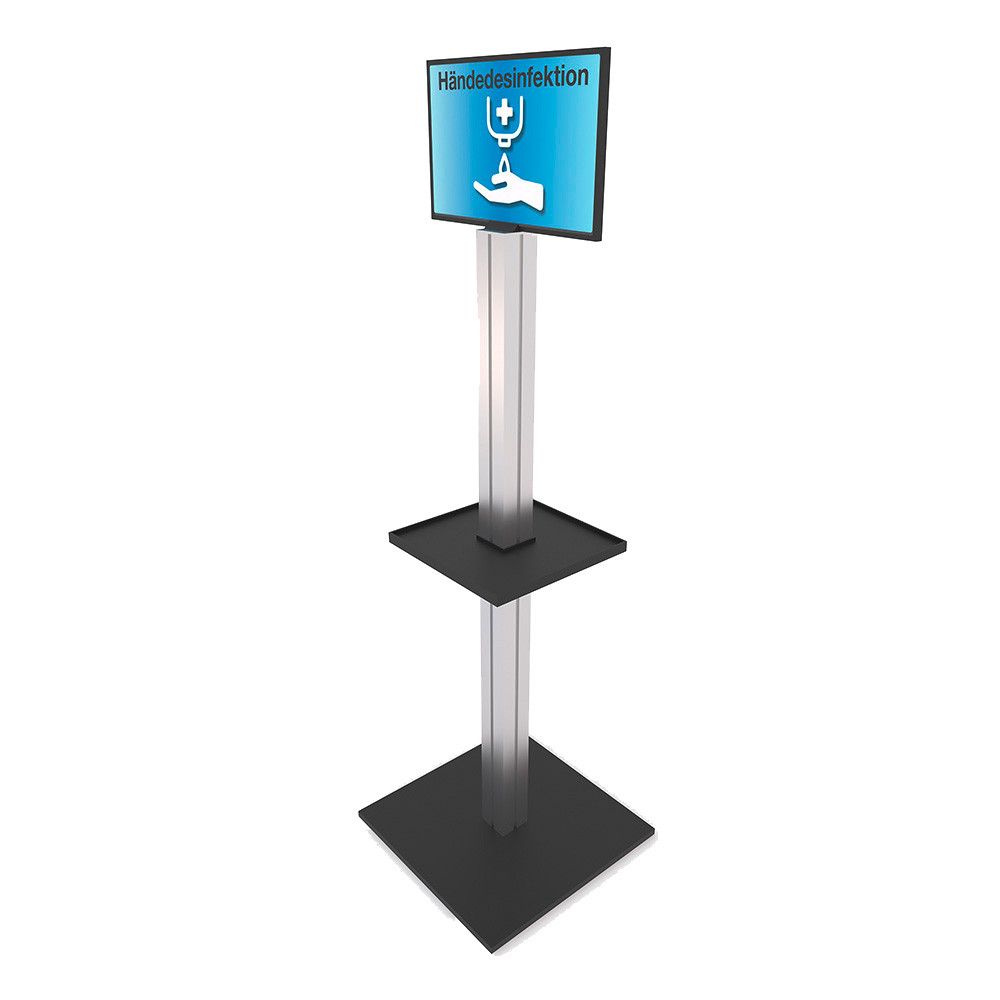 Tomi ist die reduzierte Variante von Desi. Schnell geliefert, einfach aufgestellt. Die mobile Lösung ist perfekt geeignet um bereits vorhandenes Desinfektionsmittel auf einem gut sichtbaren Ständer anzubringen. Um die Anwender optimal zu orientieren, kann das oben angebrachte Informationsschild individuell bestückt werden. Standardmässig wird der Ständer mit der Aufschrift «Händedesinfektion» geliefert. Der stabile Standfuss sorgt für eine solide, kippsichere Bedienung und enthält eine pflegeleichte Auffangschale.